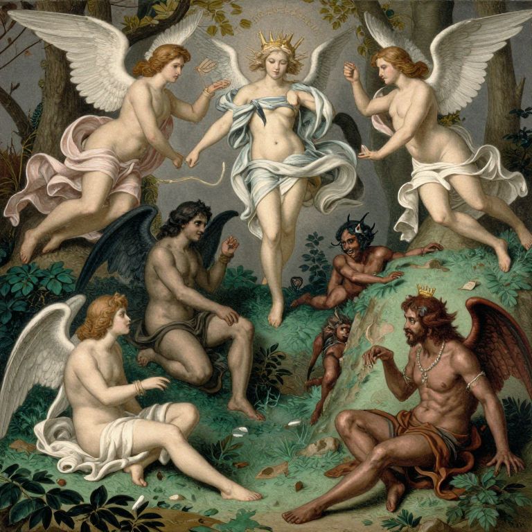 Renaissance-style painting of four white-winged angels and three demons in a forest, with a central crowned angel holding a scroll.