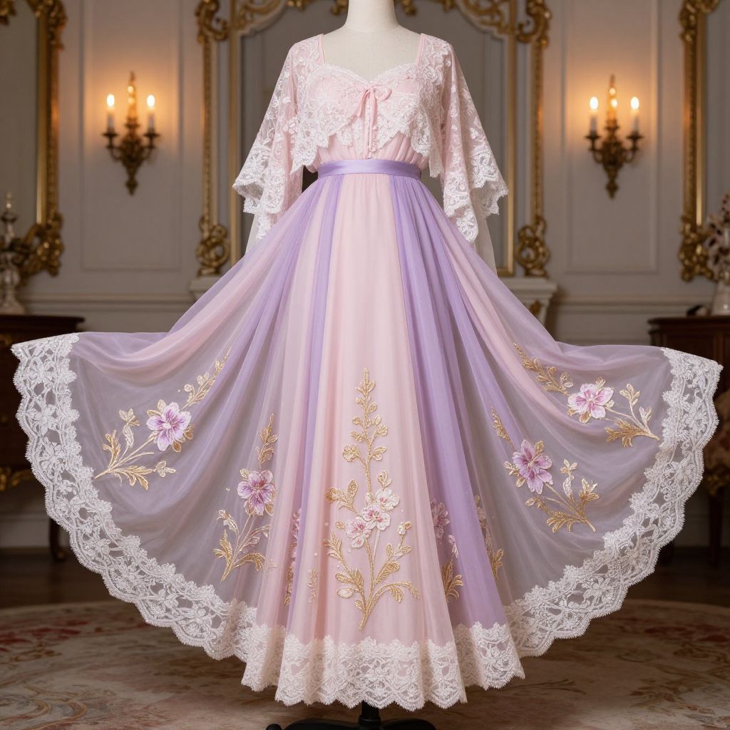 Elegant custome made of flowing silk and lace, pastel color palette blending light pink and lavender, delicate floral patterns embroidered with gold thread, model posed against a vintage Victorian interior with ambient candlelight, highly detailed fabric and shadows.
