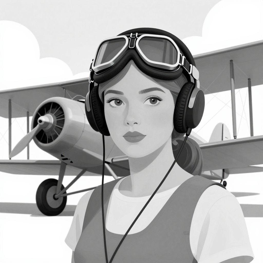 Black-and-white digital drawing of a woman with aviator goggles, headphones, and a vintage plane in the background. She has a serene expression and wears