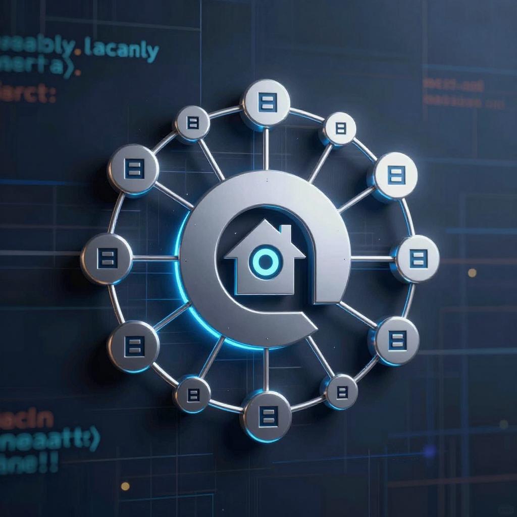 Assembly language logo, abstract representation of low-level coding with interconnected nodes and assembler symbols, high-tech digital art, glowing blue and silver tones