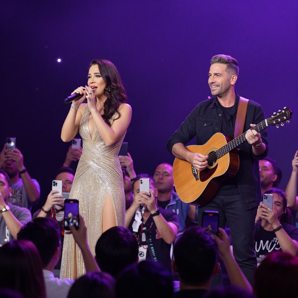 Photograph of a live concert featuring a man and woman performing on stage. The woman, with long dark hair, wears a shimmering gold dress with a high slit, singing into a microphone. The man, with short gray hair and a beard, wears a black shirt and pants, playing an acoustic guitar. The stage is dimly lit with purple and white lights, and a crowd of fans in the foreground holds up smartphones to record the performance. The background is dark, emphasizing the performers and the audience.