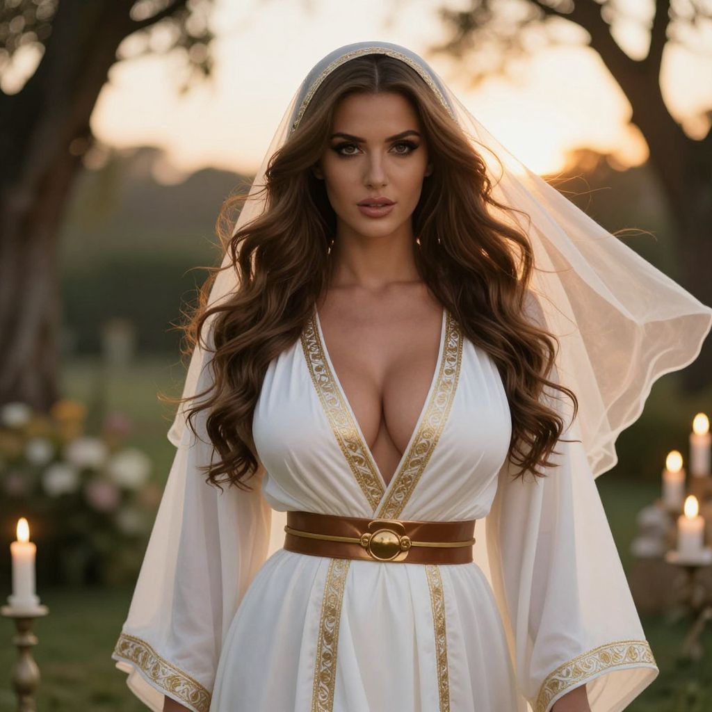 A beautiful woman with long brown hair flowing freely, wearing a luxurious white robe adorned with intricate gold trim and a sleek brown belt. She has a delicate, flowing veil covering her head, adding a mystical and elegant touch. Her eyes are deep and expressive, highlighting her sensual beauty. She has big, full tits and a sexy, confident presence, standing in a serene, candlelit garden under a soft golden sunset. The atmosphere is dreamy and romantic, with soft light filtering through the trees, enhancing her graceful and alluring figure.