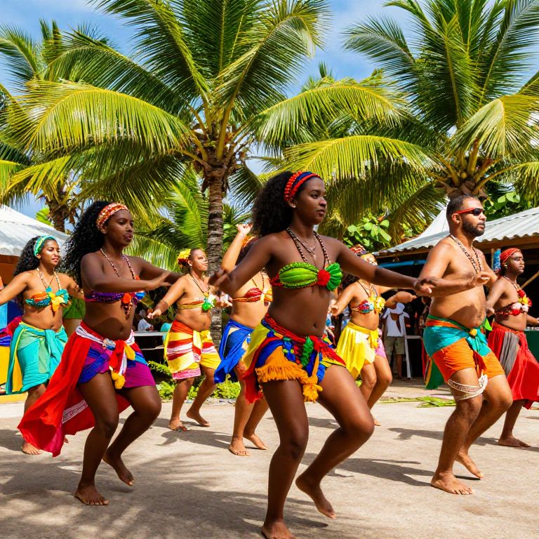 Macarana dance scene in vibrant tropical setting, energetic people in colorful clothing, festive atmosphere with bright sunlight, dynamic poses capturing rhythm, lush green palm trees and blue sky background, joyful expressions, detailed movement blur