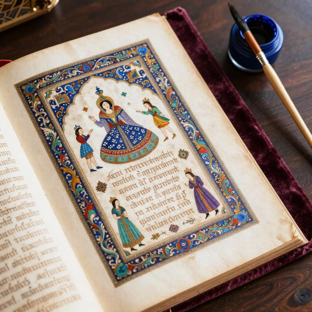 Farsiname, close-up of an open manuscript page decorated with colorful Persian miniatures, intricate border designs, and delicate script, resting on a velvet cloth beside an artist's brush and ink pot, set against a dark wooden table atmosphere of craftsmanship.