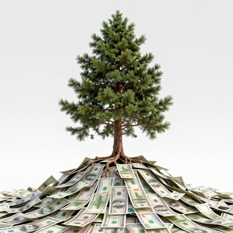 A majestic conifer tree stands rooted in a mound of shimmering currency, defying the boundaries between nature and wealth in a surreal landscape where money seems to grow like leaves.
