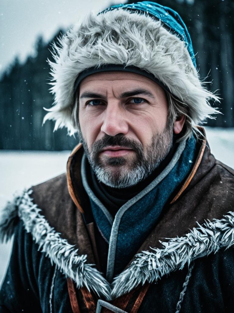 Photorealistic digital portrait of a rugged, bearded man in winter medieval attire, with fur hat and cape, standing in snowy forest.