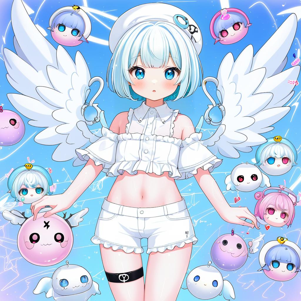 Digital illustration of an anime-style girl with short white hair, heterochromia blue and pink eyes, wearing a white frilled off-shoulder top, white shorts, and a white beret. She has large detached angel wings and a broken halo. The character is surrounded by multiple floating cute, round, winged creatures in various pastel colors, set against a bright blue sky background.