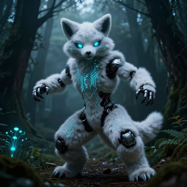 AI fursuit, a hybrid of animal and machine with soft fur overlaid by circuit-like markings, glowing eyes, and mechanical limbs, posed dynamically in a dark futuristic forest with bioluminescent plants and a misty atmosphere.