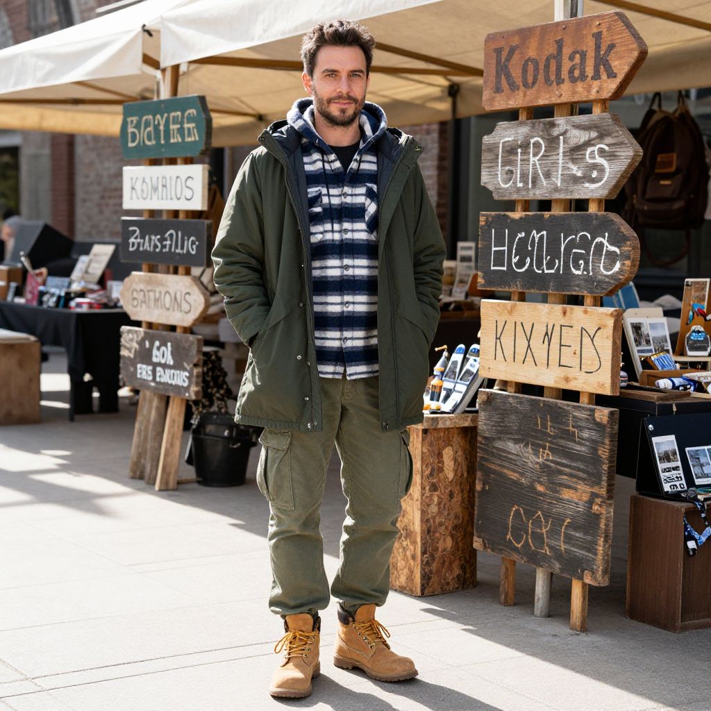 Photograph of a bearded man standing in a busy outdoor market. He has short brown hair and is wearing a green military-style vest over a black and white plaid shirt, olive green cargo pants, and brown lace-up boots. The background shows colorful triangular pennant flags strung above, people walking, and market stalls with tables and items for sale. The scene is bustling with activity, and the man stands confidently in the center of the frame, slightly smiling. The overall atmosphere is vibrant and lively.