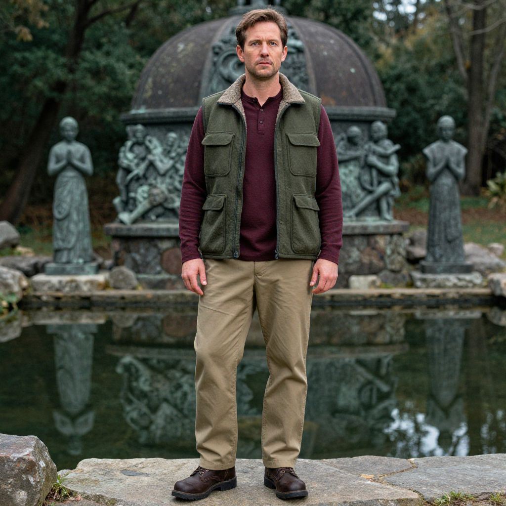 Photograph of a bearded man in a plaid shirt, olive vest, and green cargo pants, standing in a vibrant, colorful street market.