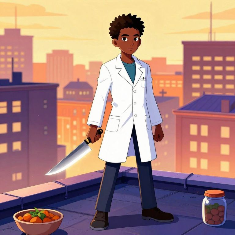 In this vibrant Manhwa art style illustration, a full-body African-American teenager stands confidently on a rooftop, wielding a magical kitchen knife with a sharp, glowing edge. The character is dressed in a white lab coat, adding an element of mystery and intrigue. The rooftop is adorned with various objects, including a bowl of food and a jar, suggesting a setting of preparation or experimentation. The cityscape in the background, with its tall buildings and warm hues, contrasts sharply with the cool tones of the character's attire, creating a striking visual balance. The interplay of colors, from the deep purples and blues of the character's coat to the bright oranges and yellows of the cityscape, enhances the dynamic and energetic atmosphere of the scene.