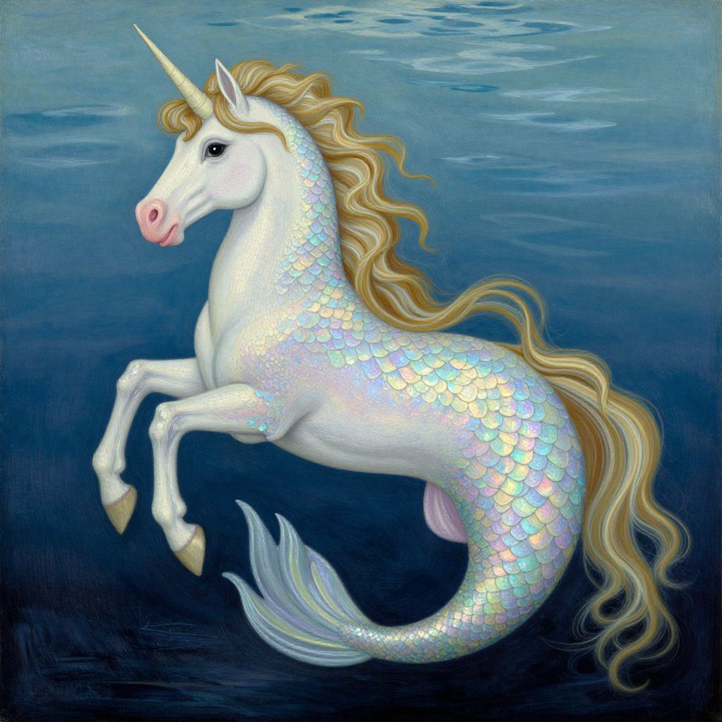 A captivating portrait depicting a graceful mermaid transformed into an elegant unicorn, evoking the surreal and dreamlike essence of Dalí's paintings. The iridescent scales shimmer like opals, merging seamlessly with her flowing mane as she emerges from an otherworldly ocean. Captured from a bird's-eye view, this enchanting scene emphasizes the whimsical atmosphere, inviting the viewer to immerse themselves in a realm where the impossible becomes reality.