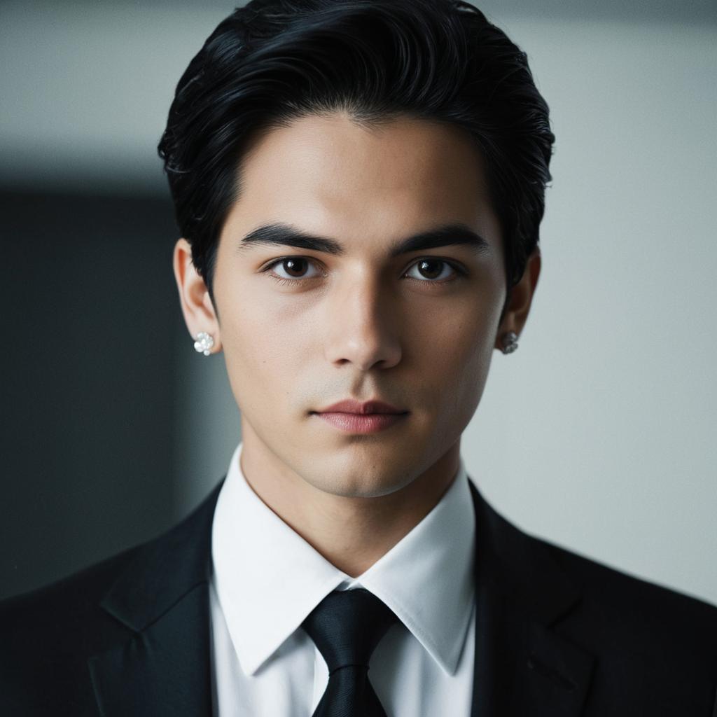Portrait of a young man with black hair wearing a shiny red leather jacket over a black shirt. He is accessorized with multiple silver necklaces and earrings, standing against a blurred background with other people. The image highlights his confident expression and modern fashion style.