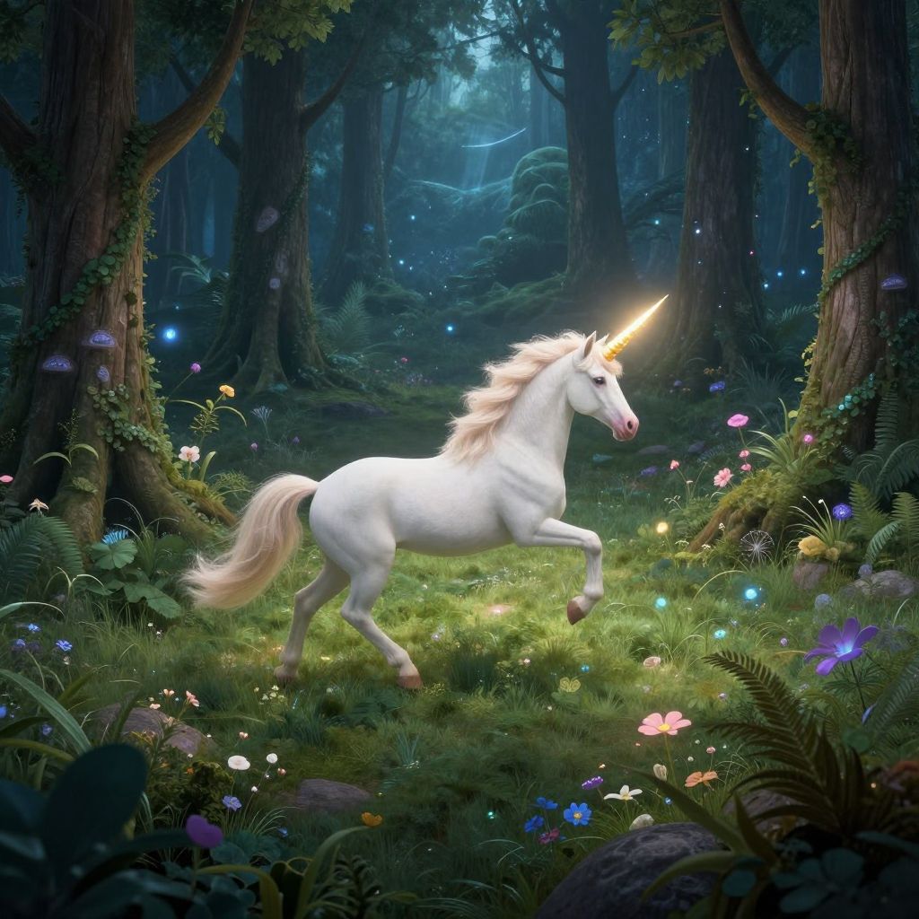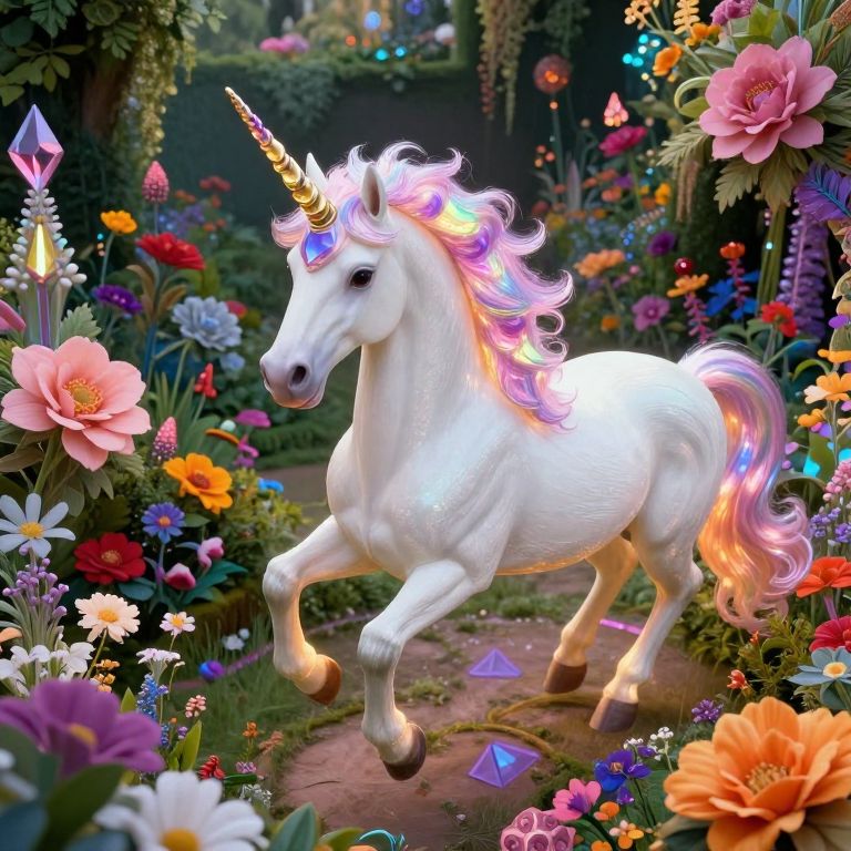 Photorealistic digital artwork of a white unicorn with a glowing, multicolored mane and horn, galloping through a vibrant, colorful garden filled