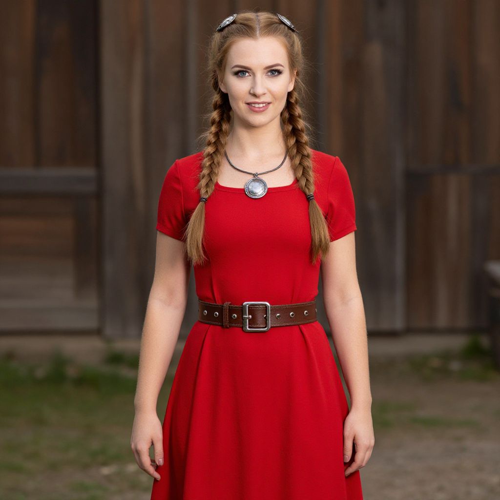 "Woman Viking Fancy Dress Costume, woman in a red dress with braids and a brown belt"