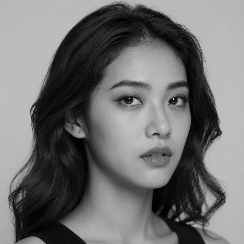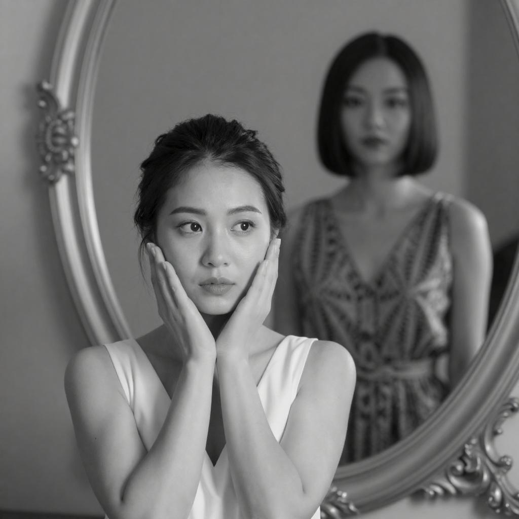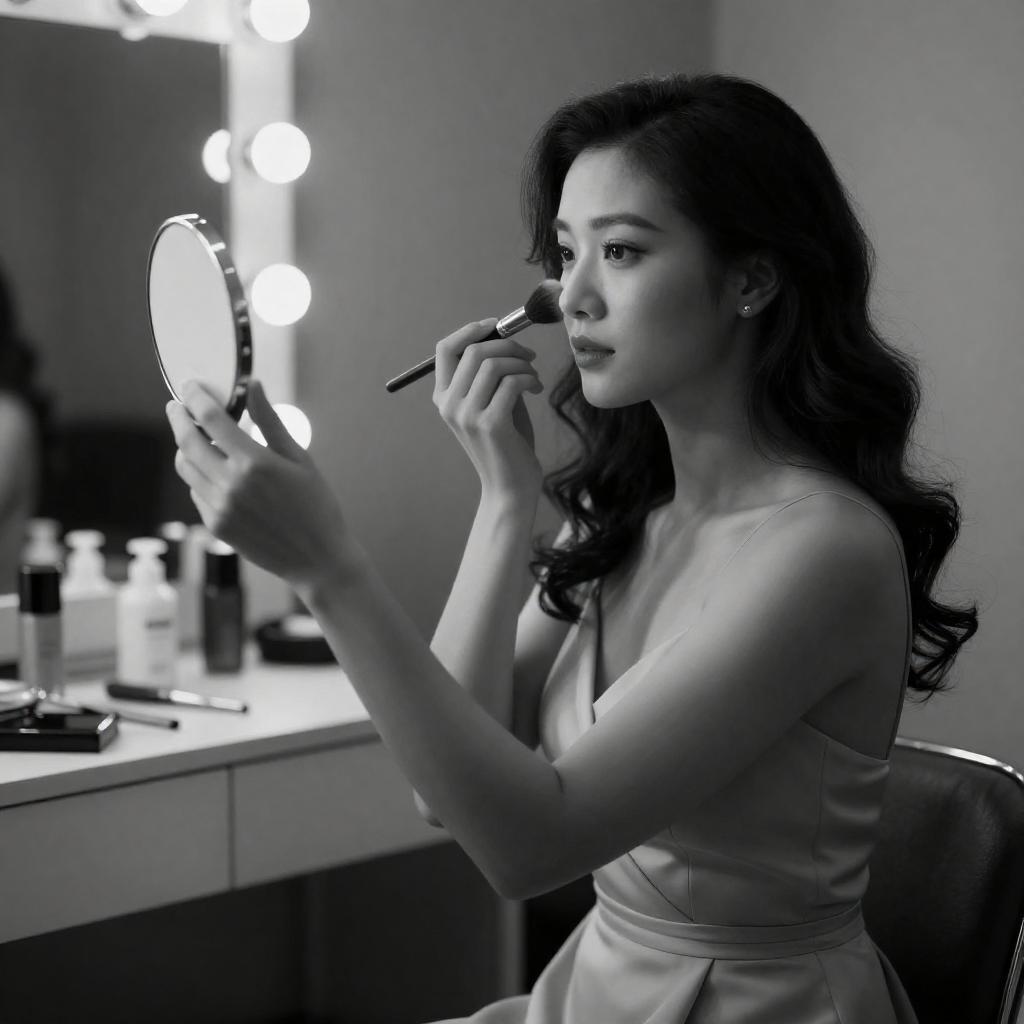 Black-and-white photograph of a woman with dark, wavy hair in an elegant dress, holding a mirror in her right hand and a makeup brush in her left, applying makeup. Background includes a blurred vanity table with lights. She is seated, looking into the mirror with focused expression. Dimly lit room.