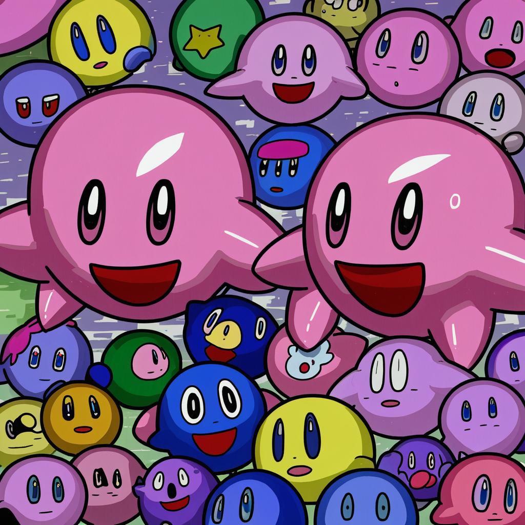 A vibrant digital illustration featuring multiple colorful blob-like characters with expressive faces, inspired by anime style. The characters are mostly round with large eyes and diverse emotions, predominantly in shades of pink, blue, yellow, and purple. The artwork has a playful and lively atmosphere.