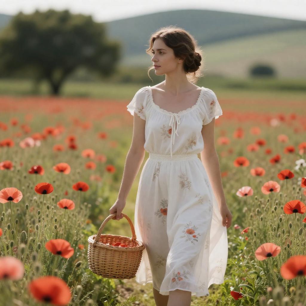 Young woman with light skin and brown hair in a white floral dress, holding a wicker basket, walking through a red poppy field. Background includes trees, greenery, and distant mountains. She has a relaxed expression, arm slightly raised.