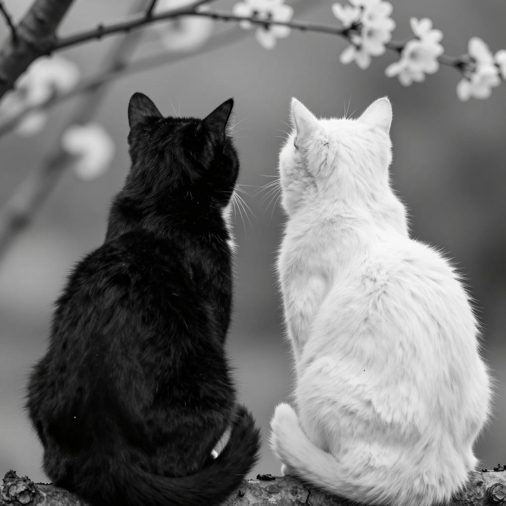 Black and white cat, back view, sitting on a branch, facing each other, black cat on left, white cat on right. Black cat has its head slightly lowered, white cat looks up. Blossom branch in background, blurred. Monochrome photograph. Cats' ears upright, tails curved. Light highlights white cat's fur, dark shadows on black cat.