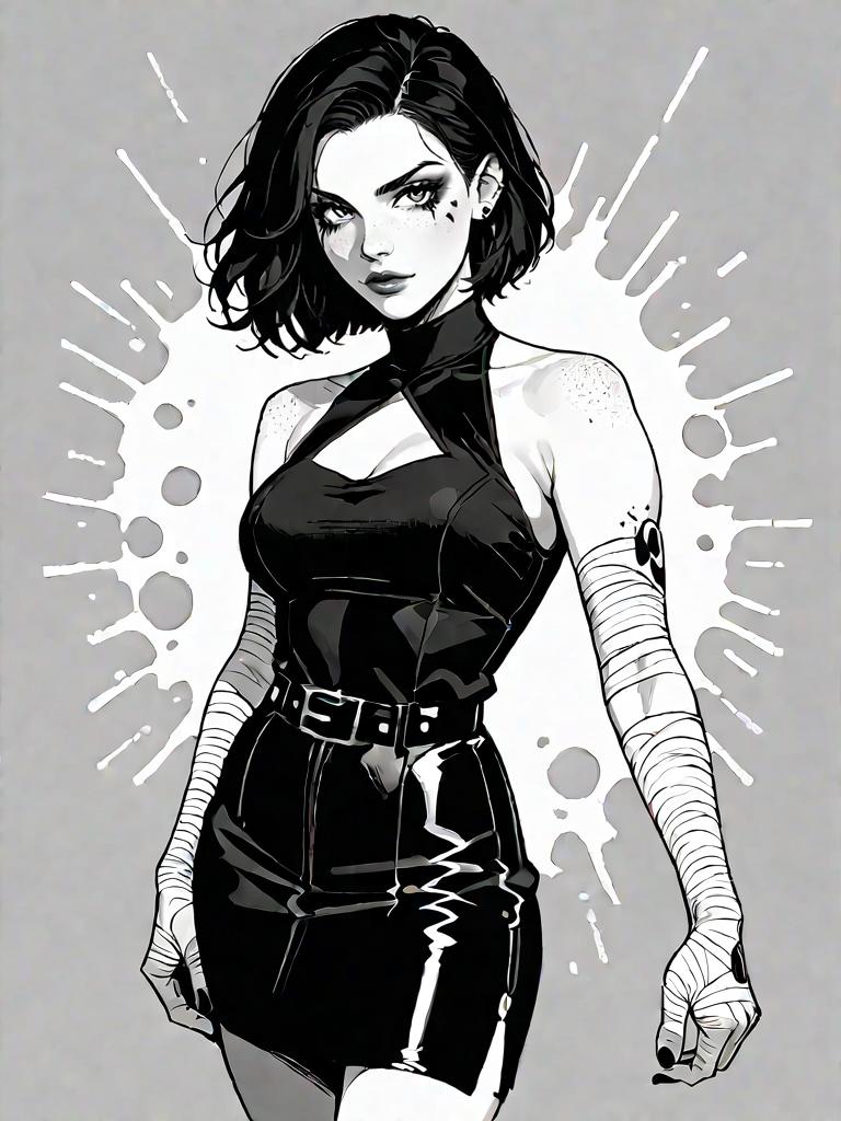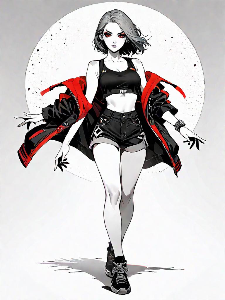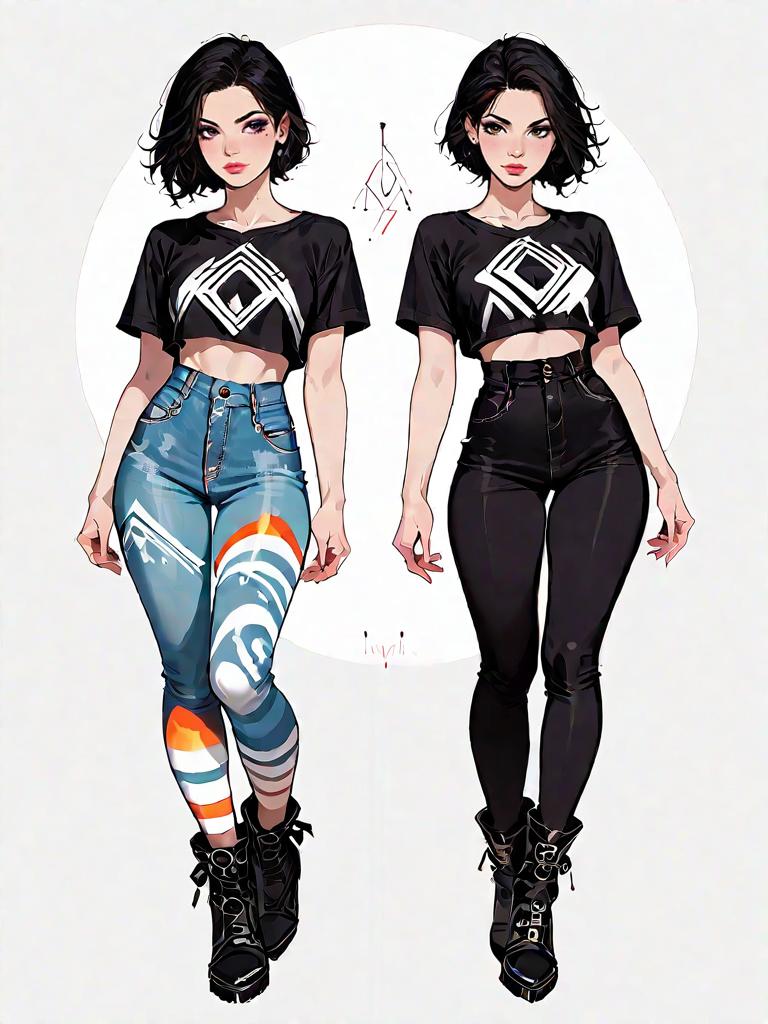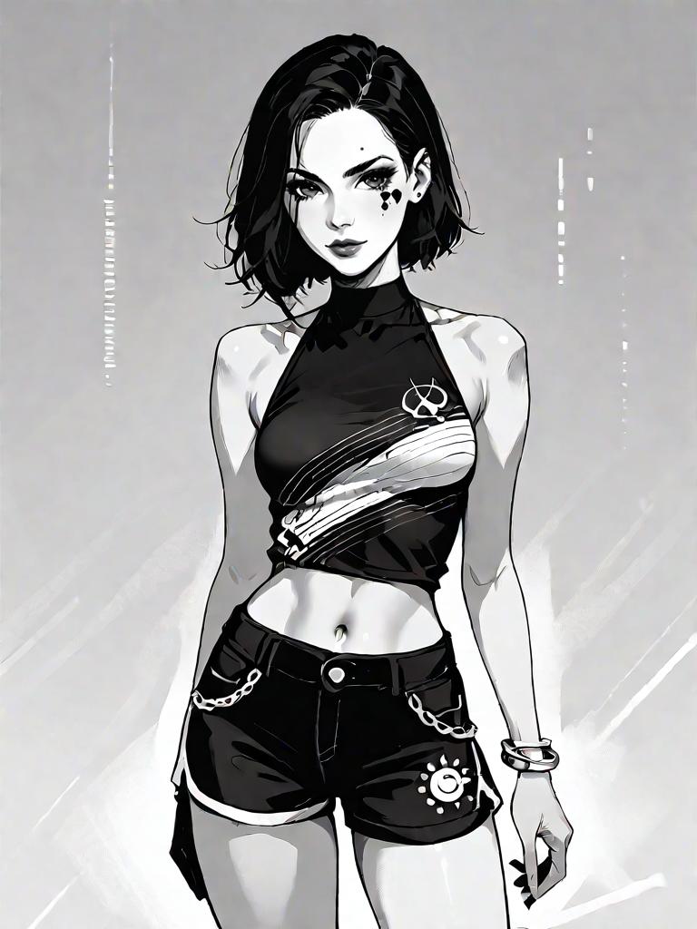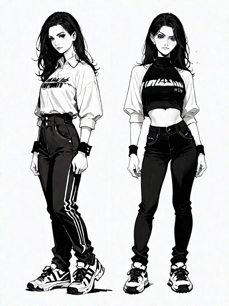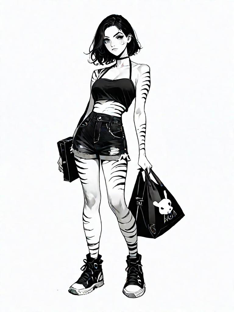 1girl, source_comics, realistic face, full body shot, Woman, streetwear, asymmetrical black one-shoulder crop top, cut-out detail, high waist camouflage cargo pants, multiple utility pockets, tapered leg silhouette, black and white high-top sneakers, shoulder strap bag with contrasting white logo, white hoop earrings, studio background