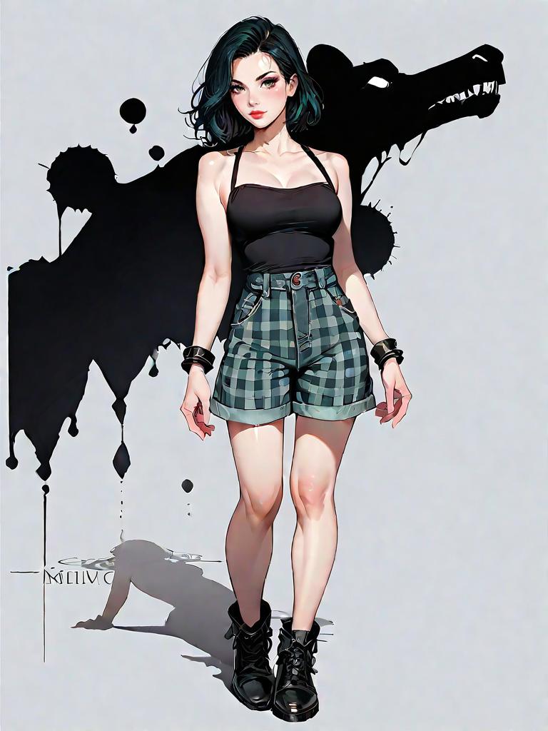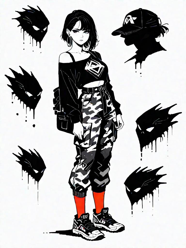 Digital artwork of a young woman in streetwear fashion. She wears an asymmetrical black one-shoulder crop top with cut-out detail, high waist camouflage cargo pants with multiple utility pockets and a tapered leg silhouette. Accessories include white hoop earrings, a shoulder strap bag with a contrasting white logo, and black and white high-top sneakers. The background features abstract black dripping silhouettes and a profile of a figure wearing a cap.