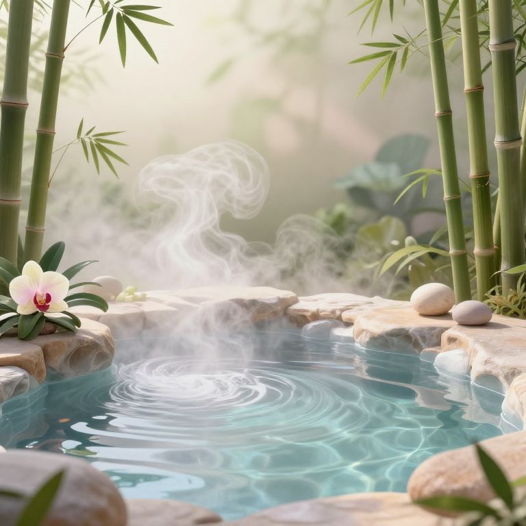 Photograph of a serene outdoor hot spring surrounded by tall, green bamboo stalks. A white and pink orchid flower with green leaves is on the left, while white stones are scattered around the stone-bordered hot spring. Steam rises from the blue, rippling water, creating a misty atmosphere. The background is softly blurred, with hints of green foliage and sunlight filtering through. The scene exudes tranquility and natural beauty, with a focus on the calm water, steam, and lush bamboo.