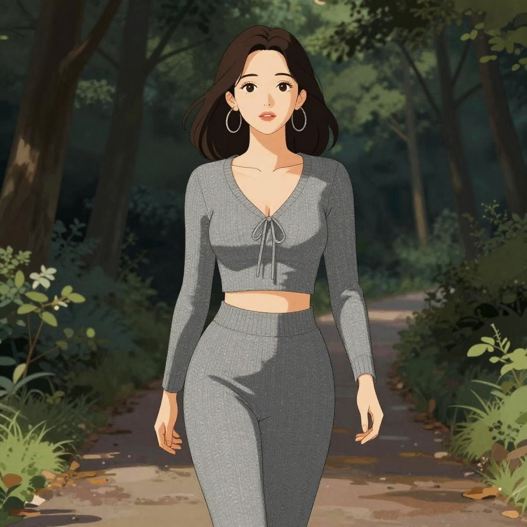 A lean woman in a casual chic heather grey rib-knit two-piece outfit, featuring a cropped top with a tie-front and high-waisted snug pants, accessorized with large hoop earrings and wavy hair, enjoying an evening walk through a forest trail, illustrated in a shogakukan style. Sexy. Pretty face and beutiful eyes