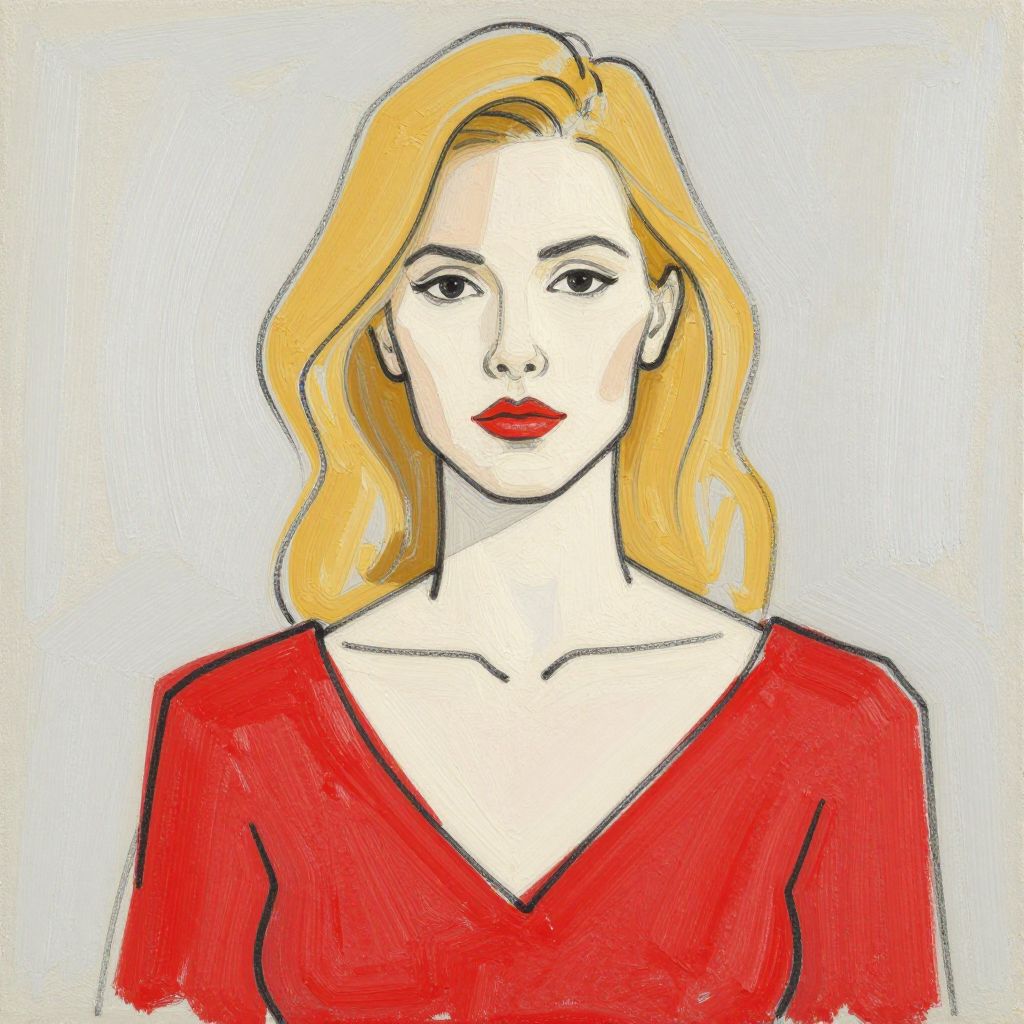 This is a digital illustration of a woman with fair skin and shoulder-length, wavy blonde hair. She has striking red lips and a neutral expression. She wears a red V-neck top that contrasts with her pale complexion. The background is a simple, light blue gradient, making the subject stand out. The illustration uses bold, black outlines and vibrant colors, with a slight impressionistic style, emphasizing clean lines and solid color blocks. The woman's face is centered, and the focus is on her upper body.