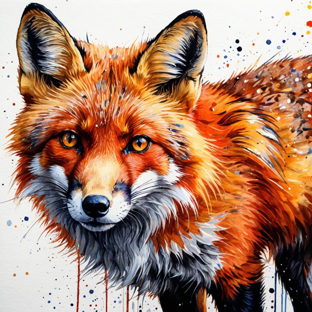Ultra-detailed watercolor and acrylic painting of a red fox with vivid orange, red, white, and black fur. The artwork features high contrast and cinematic lighting, inspired by Gustav Klimt's style, showing intricate textures and splattered paint effects.