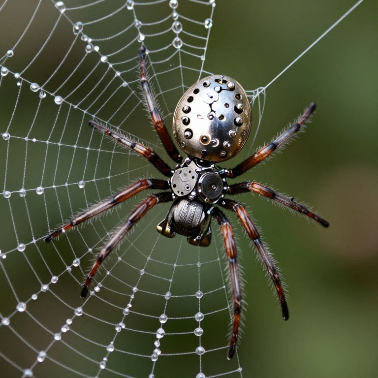 A clockwork spider weaves threads of liquid mercury into a web that hums with fragments of lost lullabies from forgotten dreamers.