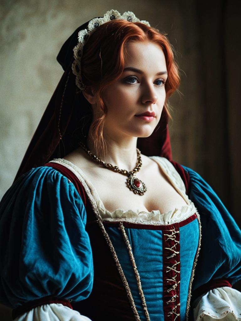 Woman in Renaissance Gown, photorealistic historical cosplay portrait, cinematic realism