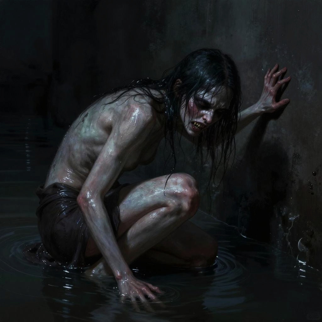 A dark, moody digital painting of a hunched, nude, pale-skinned figure with wet, glistening skin crouching in murky water. The figure's face is twisted in a grimace, with sharp teeth visible. They're reaching out towards a dark, textured wall. The lighting creates stark contrasts, highlighting the wetness and shadows. The overall atmosphere is eerie and unsettling.