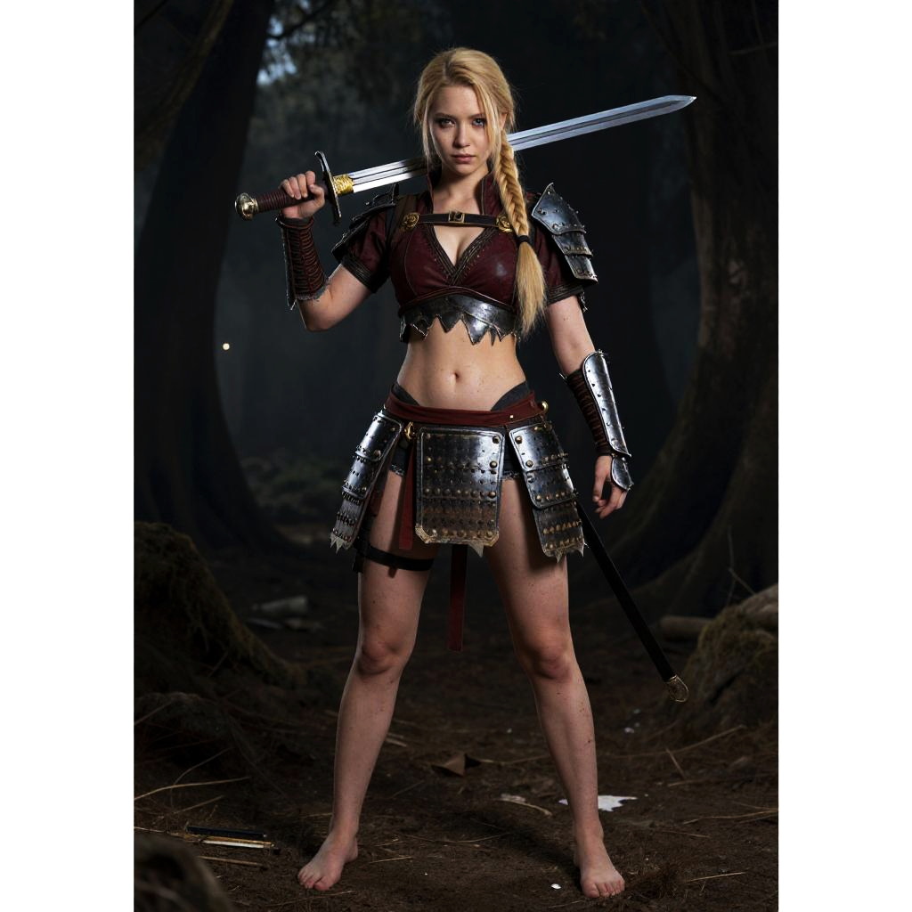 Photograph of a blonde, muscular woman in medieval warrior armor, holding a sword over her shoulder, standing barefoot in a dark, forested background