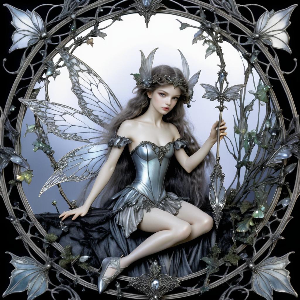 Beautiful fairy with delicate wings holding a silver mirror, set in a dark fantasy world. Styled in high detail by Arthur Rackham.