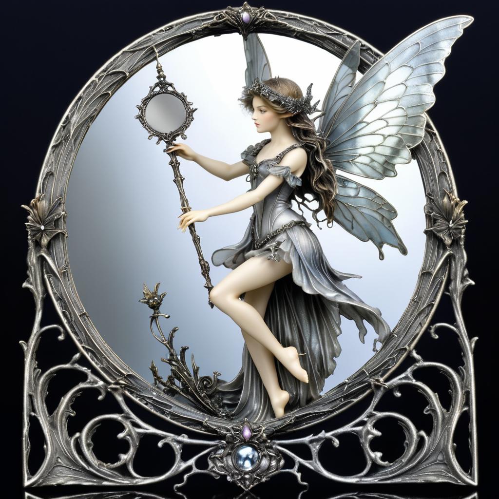 A highly detailed fantasy figurine of a beautiful fairy with delicate translucent wings. The fairy is dressed in a flowing, silver-gray gown adorned with intricate designs, holding an ornate silver mirror. She stands gracefully within a round, ornately carved metallic frame decorated with floral and gothic motifs. The background is dark, emphasizing the ethereal and magical appearance of the fairy and the silver elements of the scene.