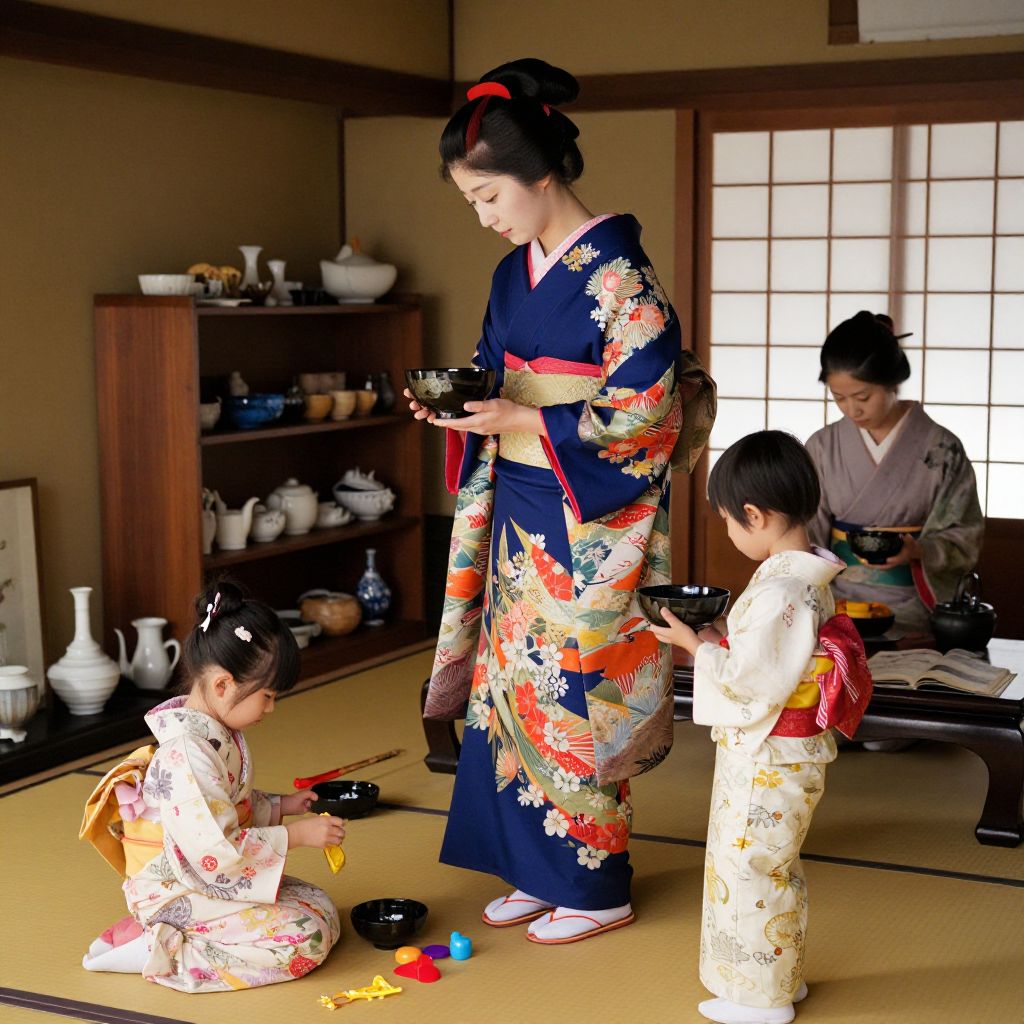 In this detailed depiction of a scene from ancient Japan, a woman in traditional attire stands gracefully, holding a bowl, while attending to the needs of her children. She is dressed in a vibrant kimono adorned with intricate floral patterns, complemented by a deep blue obi. Her hair is elegantly styled in a high bun, secured with a red ribbon. To her left, a young girl sits on the floor, engrossed in playing with a small toy, her kimono featuring delicate floral designs in soft pastel colors. Another child stands nearby, holding a bowl, mirroring the woman's actions. The room is filled with various pottery items, including bowls and vases, scattered around, suggesting a domestic setting. In the background, another woman is engaged in preparing food, her hands busy with a bowl and a teapot. The room is furnished with wooden shelves and a table, upon which a book lies open, hinting at a scholarly or educational atmosphere. The overall composition is harmonious, with the women and children arranged in a balanced manner, creating a sense of unity and domestic tranquility.