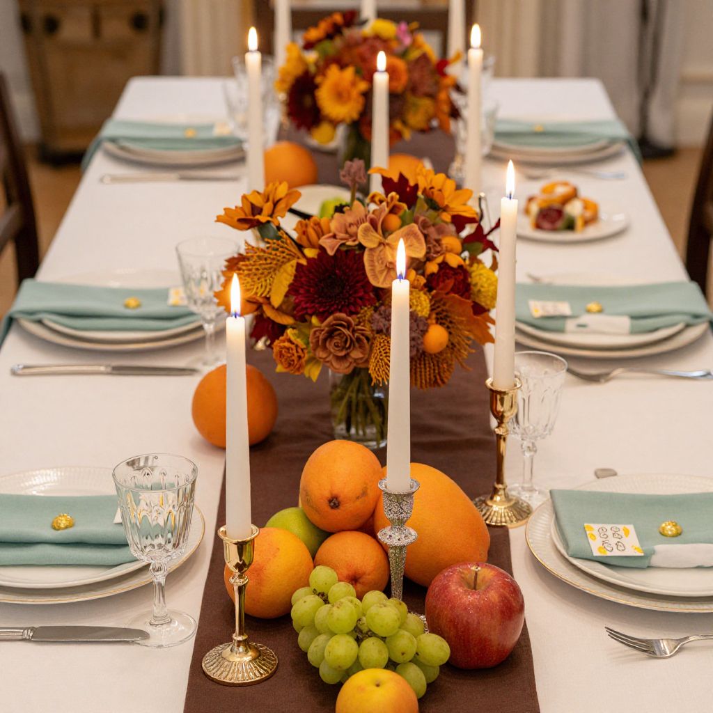Elegant wooden banquet table set for a festive occasion, featuring rows of brown woven chargers, white plates, gold cutlery, wine glasses, and a vibrant centerpiece of peach roses, green foliage, and white pumpkins, illuminated by tall white candles and complemented by blurred background seating.