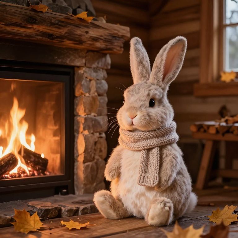 Bunnyy wearing a tiny knitted scarf sitting beside a cozy fireplace inside a rustic cabin, warm hues, wooden textures, and scattered autumn leaves visible through the window, a peaceful and heartwarming indoor scene with intricate details