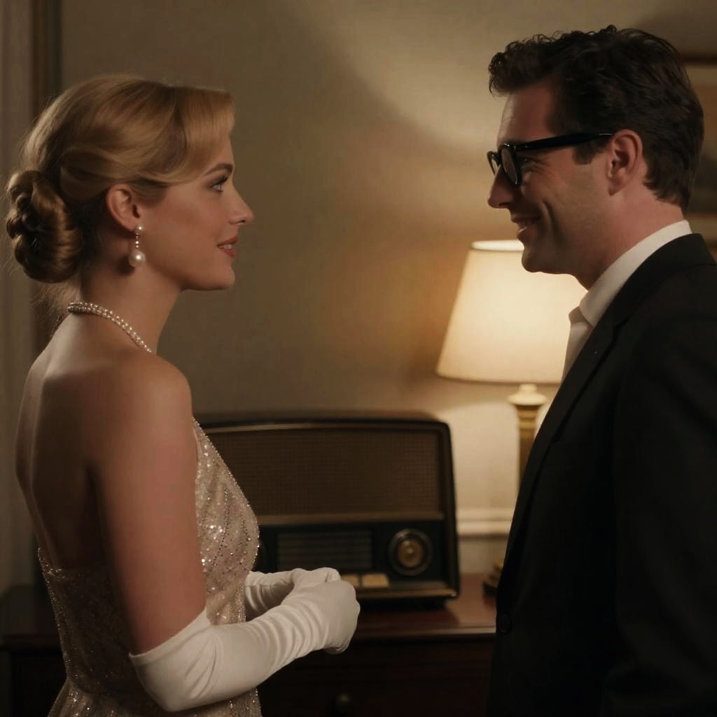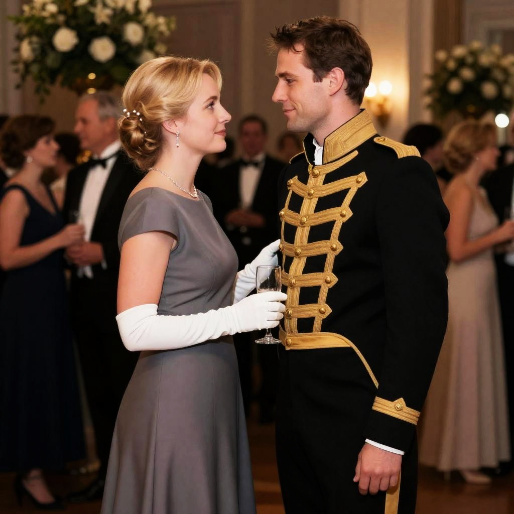 Photograph of a formal ballroom scene. A blonde woman in a gray dress and white gloves faces a brown-haired man in an ornate black and gold military-style coat. They stand close, both looking at each other with slight smiles. Background includes several people in elegant attire, dimly lit, with floral decorations and draped greenery. The man's coat has intricate gold embroidery, and the woman holds a glass. Other guests in the background have neutral or focused expressions.