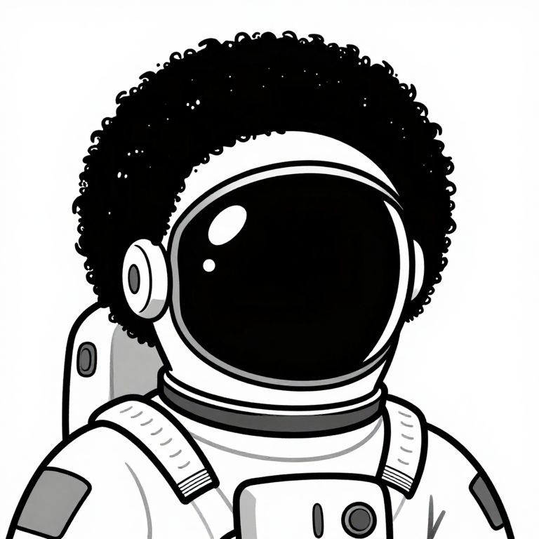 A black and white illustration of a person with an afro wearing an astronaut helmet and suit, with a rocket design on the helmet.
