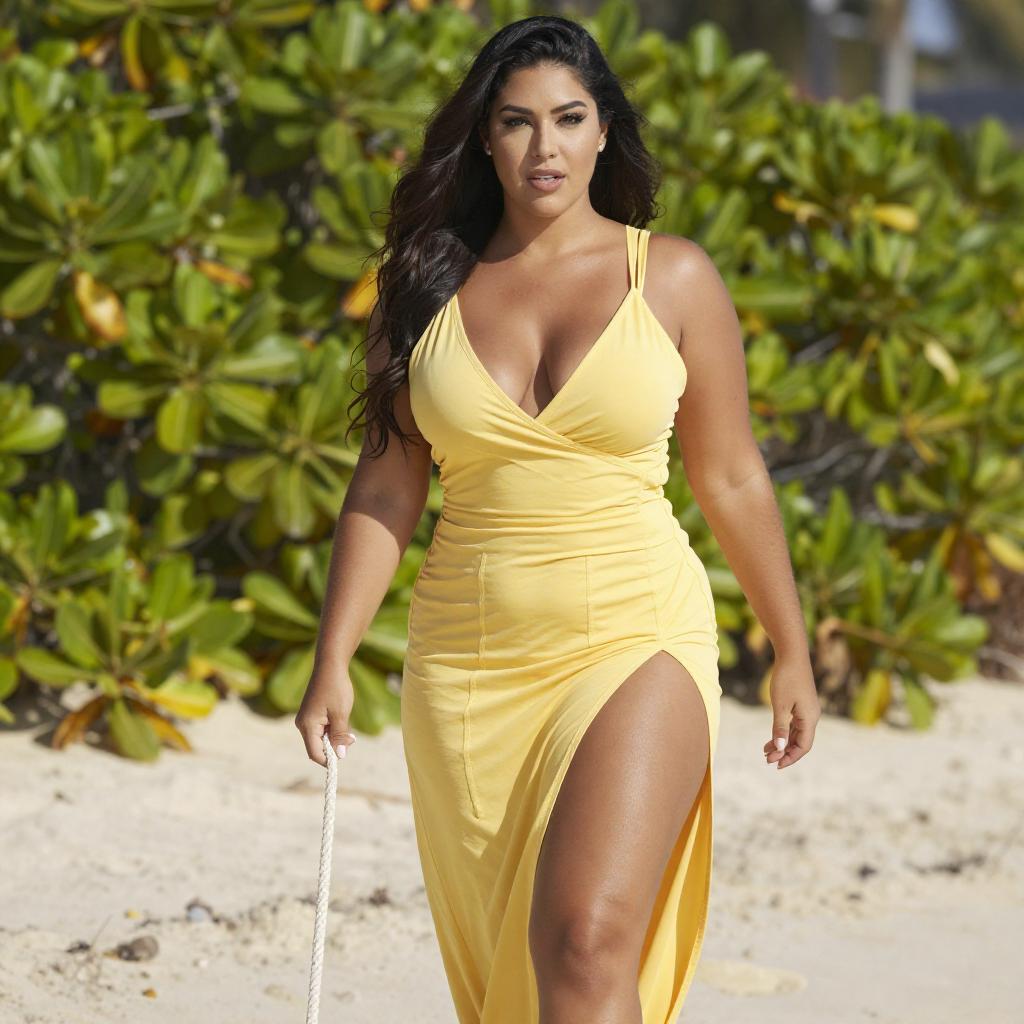 Photograph of a curvy woman with long brown hair, wearing a revealing, multicolored leopard print halter dress with side slits, standing in a wooden pergola at night. She holds a black purse, wears gold high heels, and has a confident expression. Warm lighting highlights her figure against a dark background.