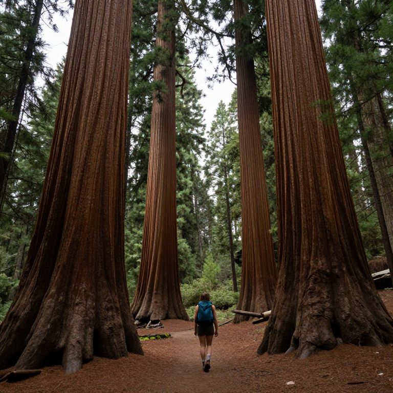 A solitary hiker traverses the timeless embrace of towering sequoias, their ancient bark whispering stories of endurance, while the crisp mountain air carries the promise of freedom and the quiet call of introspection.