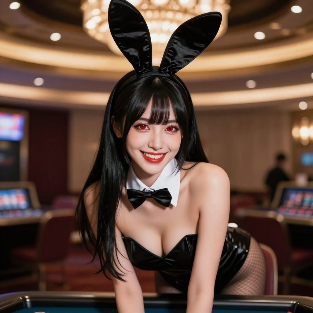 Digital illustration of an anime-style young woman with black pigtails, wearing a black bunny suit with a bowtie and white collar, in a luxurious casino. Her ample cleavage is prominently displayed, and she has a bright smile. She leans forward with her hands on a table, framed by two outstretched male arms. The background features illuminated, ornate arches, gaming tables, and seated patrons. The casino floor has a red carpet with gold patterns. The lighting is warm, creating a glamorous ambiance. The art style is highly detailed and vibrant, typical of modern digital anime illustrations.