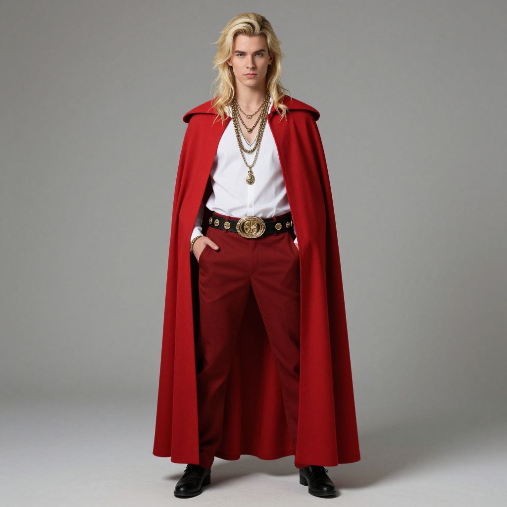 Eraserhead costume, 1boy, male focus, solo, blonde hair, cape, red cape, long hair, hand in pocket, belt, full body, jewelry, necklace, looking at viewer, pants, shirt