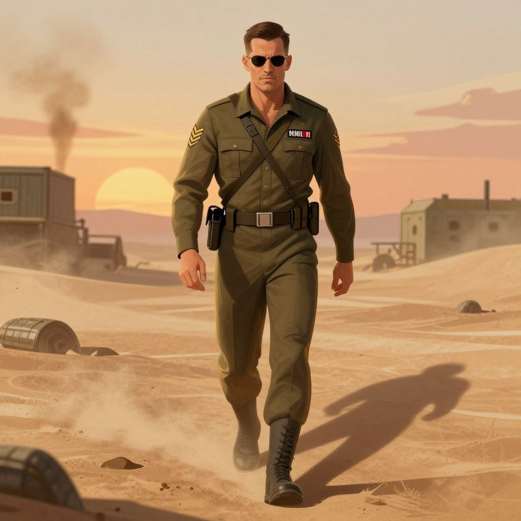Digital CGI image of a muscular, dark-skinned male soldier in olive green uniform with medals, standing sternly in front of a blurred building.