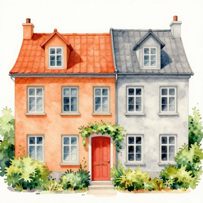 Watercolor painting depicts two charming European-style buildings with contrasting roof colors—orange and gray—featuring symmetrical windows, chimneys, and lush green shrubs surrounding a central red door, evoking a serene urban scene.