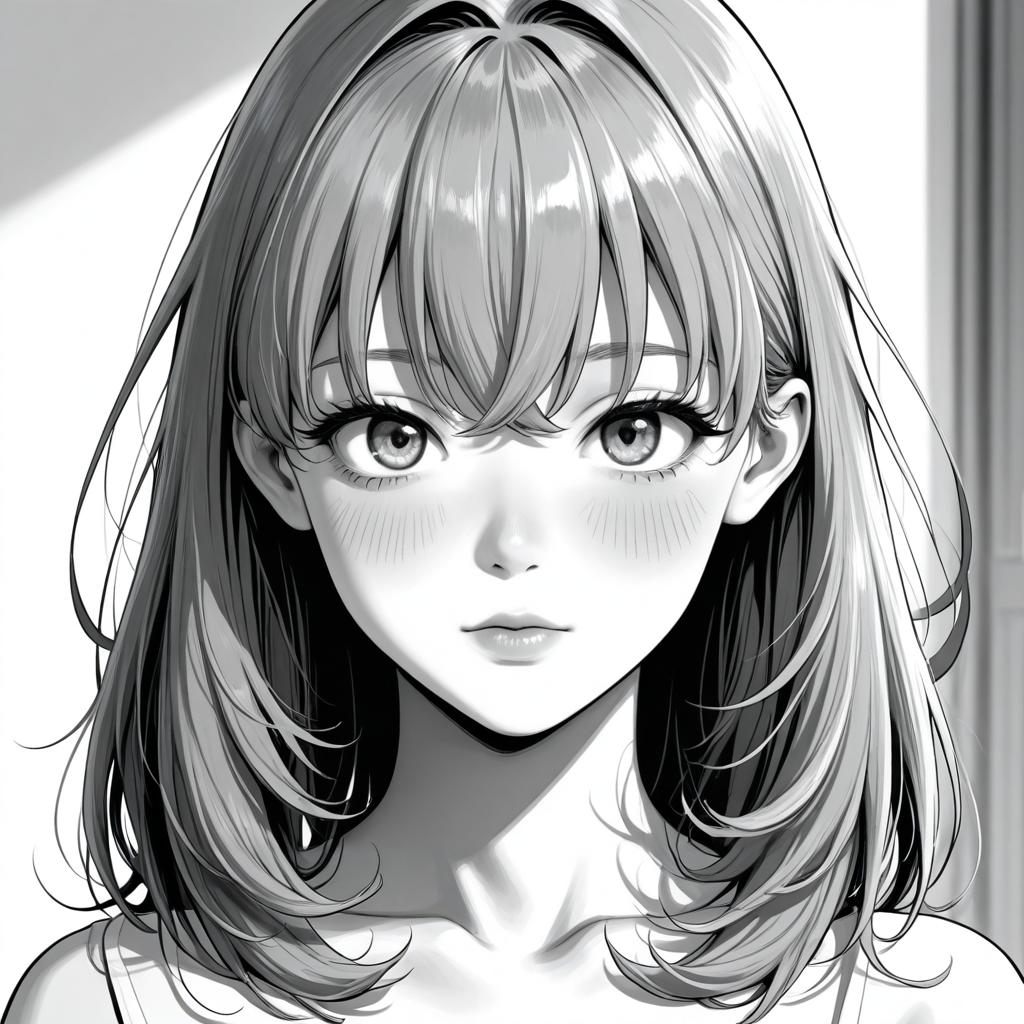 Close-up monochrome digital illustration of an anime-style girl with shoulder-length hair, large expressive eyes, and a small flower hairpin. Soft lighting highlights facial features and smooth skin. Background includes blurred window and indoor setting.
