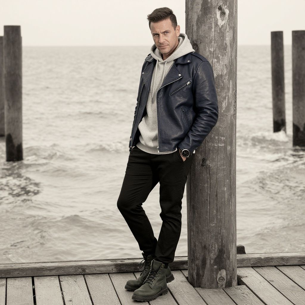A man, navy leather moto jacket, grey oversized hoodie, black slim-fit joggers, dark green combat boots, minimalistic watch, rustic wooden piers, sepia effect, leaning against a weathered post, relaxed smile, gentle waves lapping behind.Man has masculine face and piercing eyes