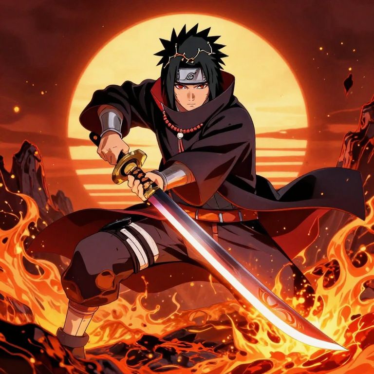 Anime-style drawing of a black-haired ninja with a headband, wielding a glowing sword, surrounded by fiery flames and a large orange sun. Intense