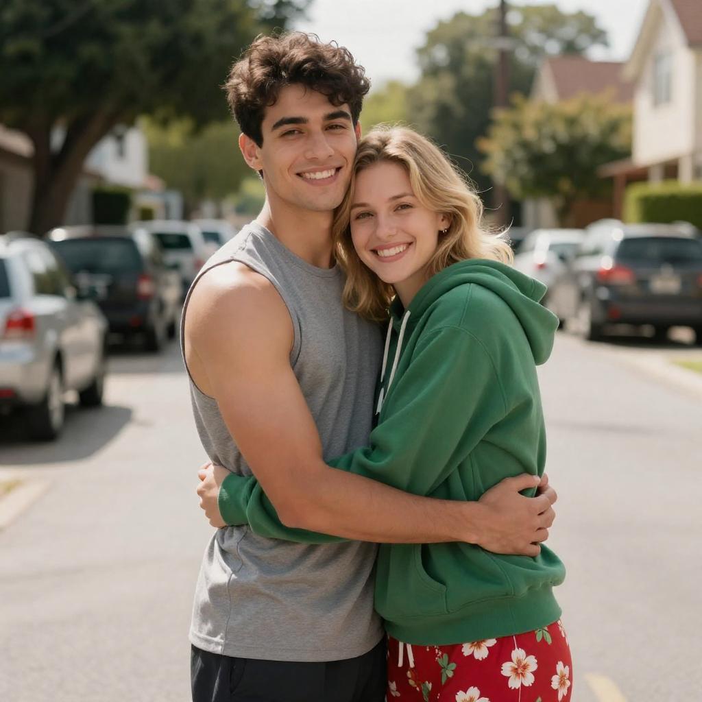 Photograph of a blonde woman with light skin, wearing a white floral top and yellow pants, being hugged from behind by a blonde man with light skin, wearing a gray t-shirt. Sunlight highlights their faces. Both smiling. Background includes a building door and plants.
